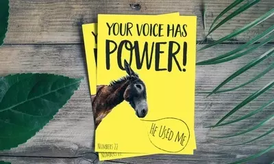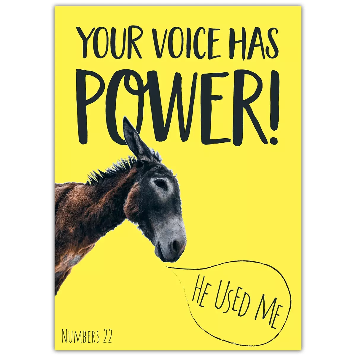- This bold yellow postcard is the perfect encouragement for any friend who is struggling to know the power of their voice. Whether it be to speak out for what they believe, to have a brave conversation, or to confront a situation. - In the Old Testament, God opened the mouth of a donkey owned by a man called Balaam and used this donkey to speak to Balaam. The story, found in Numbers 22:21-39, speaks (no pun intended) into far more than just how God can use all of creation to speak to us, so please don't think this is trivialising how the Lord works - but there is definitely the encouragement that we can all be used by the Lord. - If the Lord can open the mouth of a donkey and speak, He can definitely speak through you or I! So, share the encouragement that we can all be used by the Lord for His purposes, and we do not need to shy away from this.