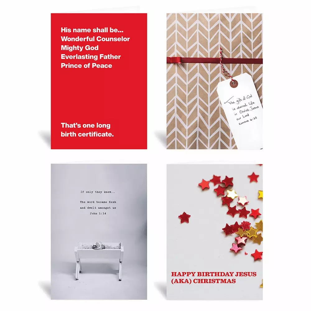 This Christian Christmas card is a take on Isaiah 9 where Jesus' birth is predicted by the Old Testament prophet Isaiah "For to us a child is born, to us a son is given, and the government will be on his shoulders. And he will be called Wonderful Counsellor, Mighty God, Everlasting Father, Prince of Peace."